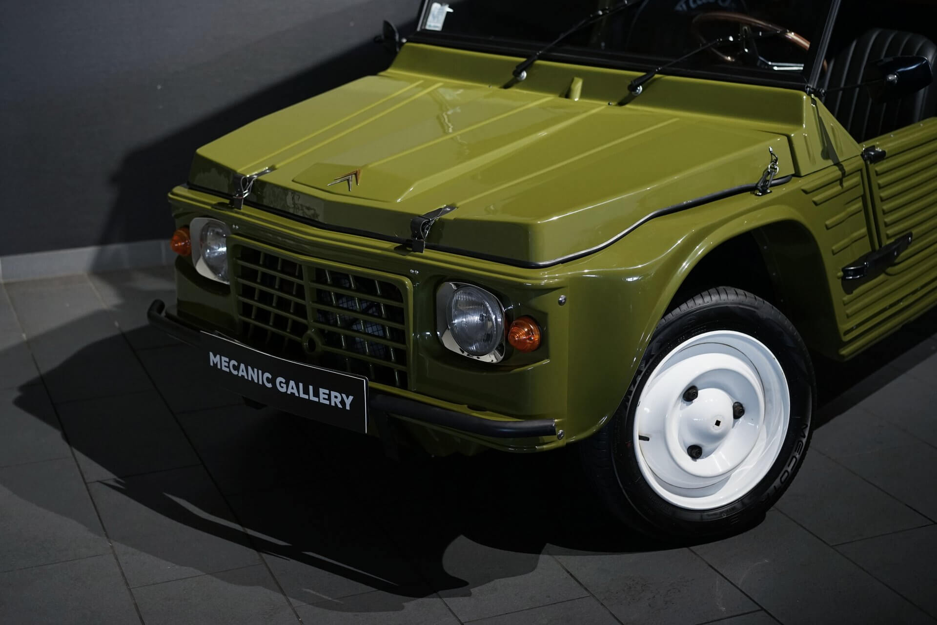 Il est à noter que c’est de manière tout à fait volontaire, pour des raisons de préférence d’aspect, que le dernier propriétaire a installé une bassine et des panneaux de carrosserie de Méhari pré-77 (tableau de bord avec petit compteur, clignotants avant et arrière ronds, plaque minéralogique fixée sur le haillon, etc).